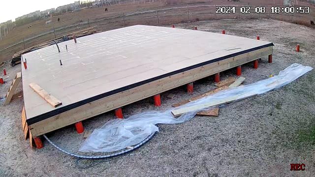 Погода наконец то умерила свои водные порывы и дала поработать. До дождей бригада успела полностью утеплить перекрытие, закрыть осп и сверху закрыть пароизоляцией. В таком состоянии перекрытие опять подверглось испытанию двухдневными дождями. ОСП было закрыто пароизоляцией, часть квик дека сверху закрыли обычной плёнкой. По результатам двух дней дождей и сильного ветра под плёнкой на квик деке вода была. На пароизоляции стояли лужи. Плёнку сняли, воду согнали, разрезали пароизоляцию - ОСП под ней была сухой. Разрез заклеили скотчем и продолжили настил квик дека после высыхания воды на пароизоляции. В комментариях к предыдущей статье задали вопрос, как ведёт себя квик дек под дождём и как он в работе. После дождя панели высыхают за несколько часов без всяких последствий. Стыки не теряют геометрии, ничего не разбухает, то есть воды панели не боятся и это факт. В работе тоже удобные, не тяжёлые, перевозить можно хоть на универсале(длина панелей 1830мм). Собираются шип-паз с проклейкой кл