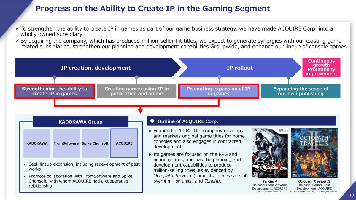 Крупная японская медиакомпания Kadokawa Corporation объявила о пополнении своего портфолио игровых студий — теперь в нем присутствует студия Acquire, известная многим по серии JRPG Octopath Traveler. Информацию о сумме сделки пока не раскрыли публике. В своем отчете компания указывает, что приобретая этого разработчика, она надеется на "синергию" с другими дочерними студиями-разработчиками (FromSoftware и Spike Chunsoft) для расширения линейки консольных игр, а также укрепления возможностей планирования и разработки всей группы. Интересно то, что ранее Acquire создала такие франшизы, как Tenchu и Way of the Samurai, но не могла разрабатывать по ним игры, так как права на IP находились у FromSoftware и Spike Chunsoft соответственно. Судя по заявлению выше, есть высокая вероятность, что новая дочерняя студия Kadokawa может вернуться к этим франшизам и создавать новые игры по ним в сотрудничестве с другими разработчиками.