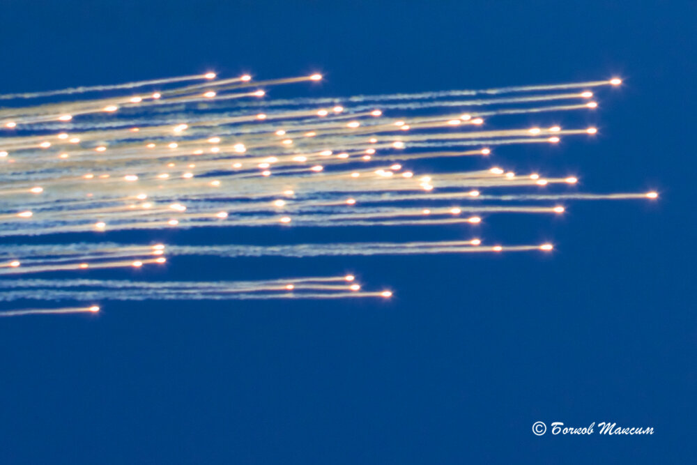 Оба самолета выполнили бочку, продолжая сыпать тепловыми ловушками… На улицу выскочили генералы, а за ними прекрасная половина, с восхищением глядя на огненные шарики рассыпаемые самолетами…