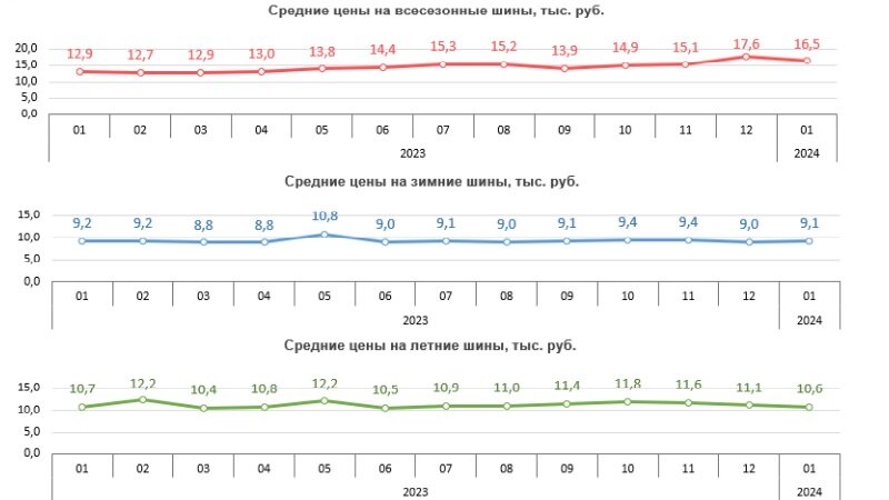 Эксперты российского агентства НАПИ, занимающегося аналитикой автомобильного и шинного рынков, отметили позитивные изменения цен на бюджетные и среднеценовые шины. По итогам первого месяца текущего года наблюдается некоторое удешевление летних и всесезонных покрышек для легковых автомобилей. Например, резина класса All-Season с декабря 2023 по январь 2024 в среднем подешевела почти на 1,1 тыс. руб. Летние покрышки за тот же период потеряли в цене около 500 руб. Но в то же время зимние автошины в среднем подорожали на 100 руб., что связано в первую очередь с ростом сезонного спроса. На годовом таймфрейме, наоборот, зимние покрышки подешевели на такое же значение. С января прошлого года по январь текущего года их средняя стоимость упала с 9,2 до 9,1 тыс. руб. Такая же тенденция наблюдается в сегменте непремиальных летних автошин. Они также подешевели в среднем на 100 руб, с 10,7 до 10,6 тыс. руб за прошедший год. В категории всесезонных шин тенденция противоположная. За год их средняя ст