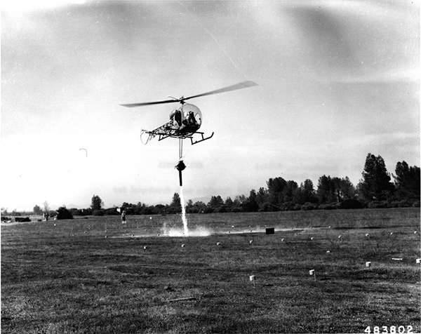 С 60-х годов для пожаротушения стали активно использовать вертолеты с водосливными устройствами на внешней подвеске. Достоинством вертолетов, несмотря на большие эксплуатационные расходы и ограниченную грузоподъемность, является возможность наполнять емкости для воды практически в любом водоеме на режиме висения, а также большая эффективность за счет повышенной точности сброса. На наполнение емкости обычно уходит всего несколько секунд. Первые опыты в этой области были проведены в 1957 году на лёгком вертолёте Bell 47. Он доставлял воду в прорезиненных мешках емкостью 250 л, закрепленных под фюзеляжем.