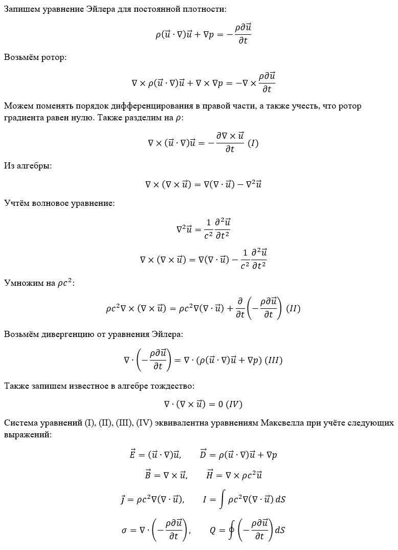 Самое применяемое в быту людей физическое явление, которое и исходно было сформулировано через эфир, и адекватное объяснение имеет только через эфир – это электромагнетизм. Я уже выкладывал наиболее общее сведение уравнений Максвелла к гидродинамике. У нас имеется полная аналогия между аналитическими закономерностями в электродинамике и гидродинамике. Осталось лишь понять, какие именно характеристики у среды, которая воспроизводит все эти силы.