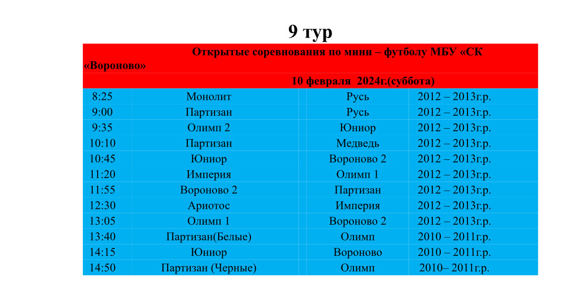 10 февраля 2024 года (Суббота) пройдёт 9 тур соревнований по мини-футболу среди детей 2010-2011, 2012-2013, 2014-2015 г.р., на призы МБУ "СК "Вороново" Матчи команд будут проходить в спортивном зале МБУ "Спортивный комплекс "Вороново", расположенном по адресу: г. Москва, п. Вороновское, п. ЛМС, мкр. Центральный, дом 40, стр. 1 Расписание игр 9 тура: (10.02.2024 года суббота) 08:25 Монолит - Русь (2012-2013) 09:00 Партизан - Русь (2012-2013) 09:35 Олимп2 - Юниор (2012-2013) 10:10 Партизан - Медведь (2012-2013) 10:45 Юниор - Вороново2 (2012-2013) 11:20 Империя - Олимп1 (2012-2013) 11:55 Вороново2 - Партизан (2012-2013) 12:30 Ариотос - Империя (2012-2013) 13:05 Олимп1 - Вороново2 (2012-2013) 13:40 Партизан белые - Олимп (2010-2011) 14:15 Юниор - Вороново (2010-2011) 14:50 Партизан (черные) - Олимп (2010-2011) Видеотрансляция матчей будет доступна в ВК(МБУ «СК «ВОРОНОВО») в день матча! #минифутбол #вороново #мбусквороново