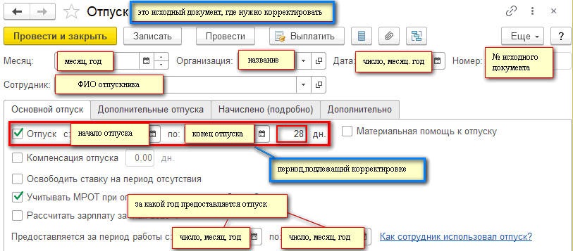 Пояснения к рисунку: красным цветом выделены данные, которые заполняются в исходном документе, а синим помечено, как предложено корректировать при отзыве отпускника, если период закрыт.