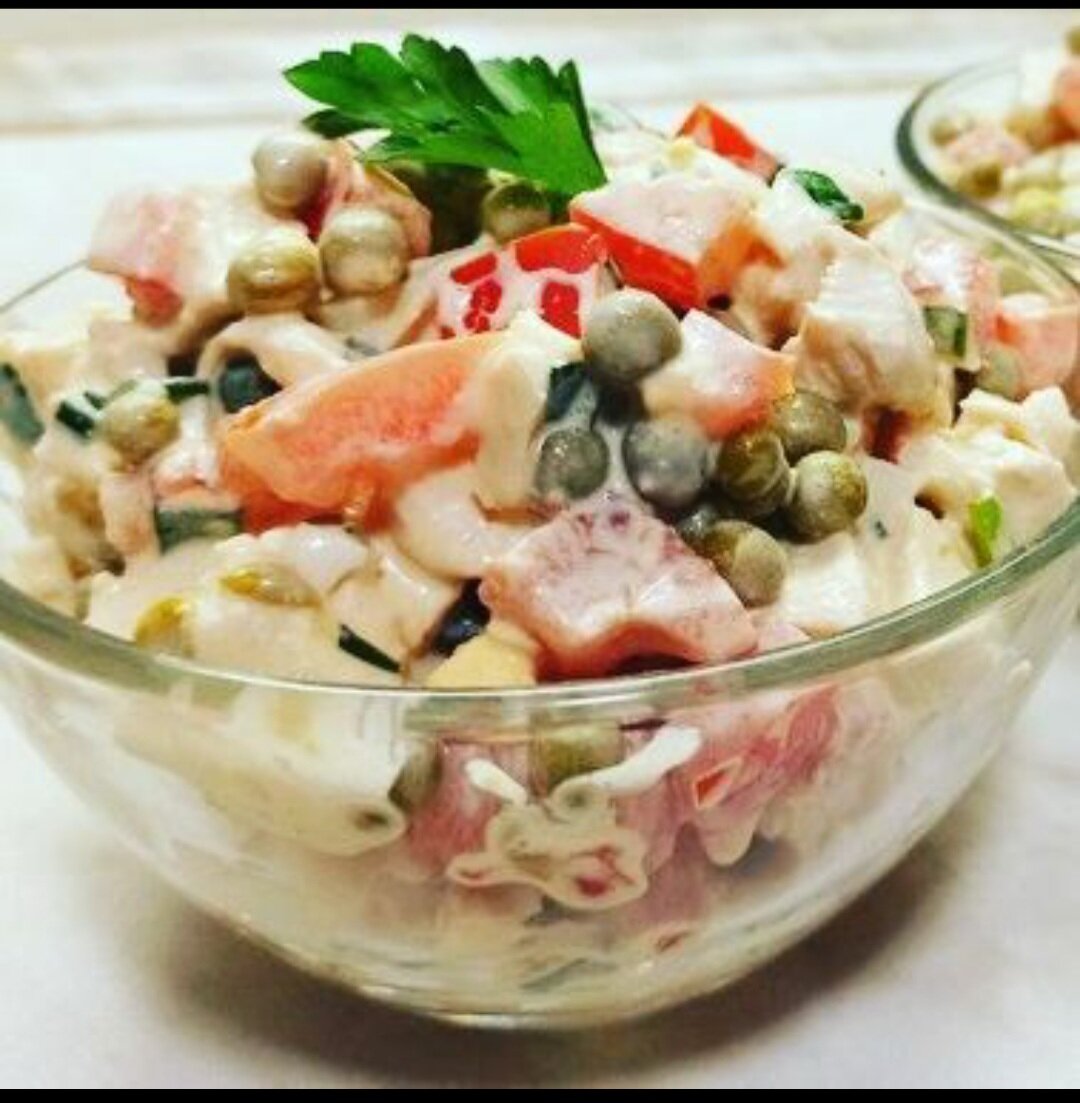 САЛАТ С КУРИЦЕЙ, ПОМИДОРАМИ И ГОРОШКОМ ИНГРЕДИЕНТЫ: Филе куриное (отварное) — 350 гр Яйцо куриное (отварные) — 3 шт Помидор — 3 шт Горошек зеленый (консервированный) — 400 гр Лук зеленый (маленький) — 1 пучок Соль — по вкусу Сметана — 4 ст. л. СПОСОБ ПРИГОТОВЛЕНИЯ: Куриное отварное филе нарезаем кубиками. Помидоры нарезаем кубиками, предварительно удалив мякоть (так салат не стечет). Все ингредиенты кладем в салатник и добавляем нарезанные кубиком отварные яйца, измельченный зеленый лук, горошек и соль по вкусу. Соединяем добовляем сметану, перемешиваем. Приятного аппетита!