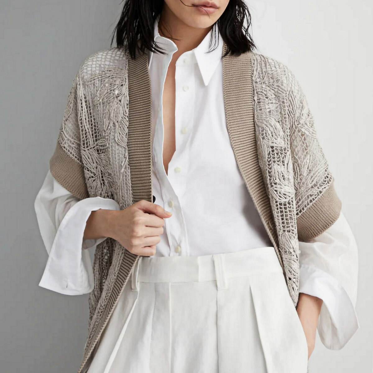 Изящные детали и трикотажная отделка Brunello Cucinelli объединяются в длинном кардигане Net Embroidery. Легендарный узор вязки сеткой, представленный в культовых нейтральных оттенках, покрывает всю поверхность и сочетается с изысканной вышивкой, воспроизводящей элегантный цветок магнолии. Завершающая вышивка из нежных пайеток придает модели маленькие сияющие ноты. Наконец, контрастные детали из трикотажа в рубчик завершают изделие.