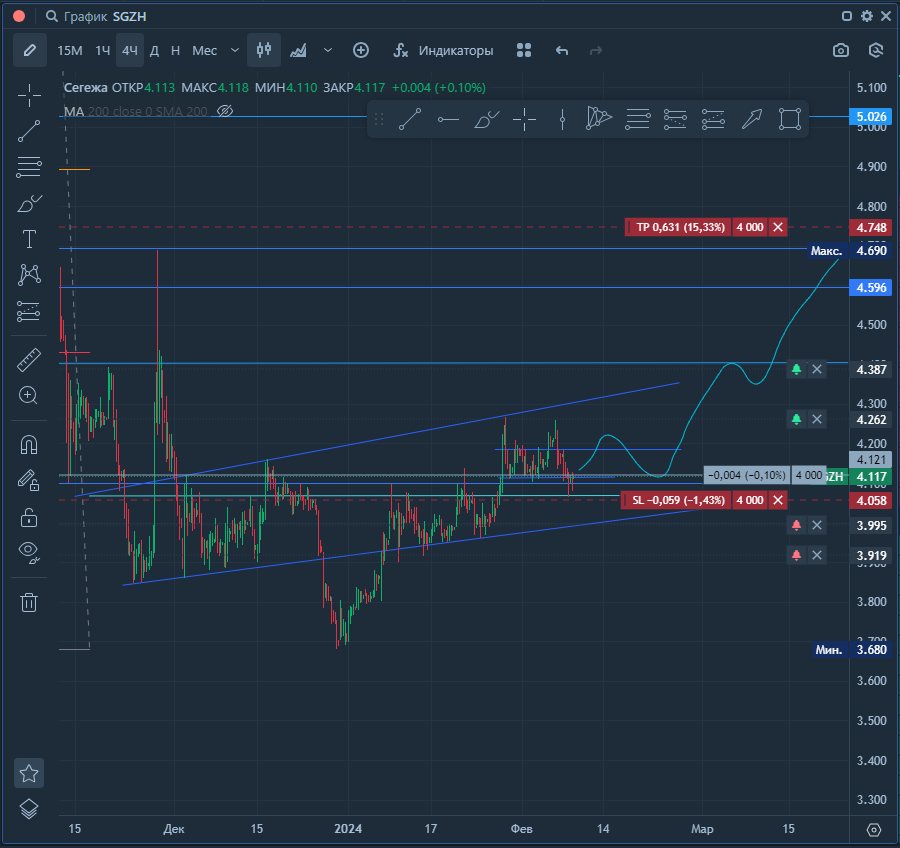 Смотрите пост от 5 февраля. Цена пробила уровень поддержки 4.1 р. и вернулась опять за уровень, тем самым показав ложный пробой тенью свечи.