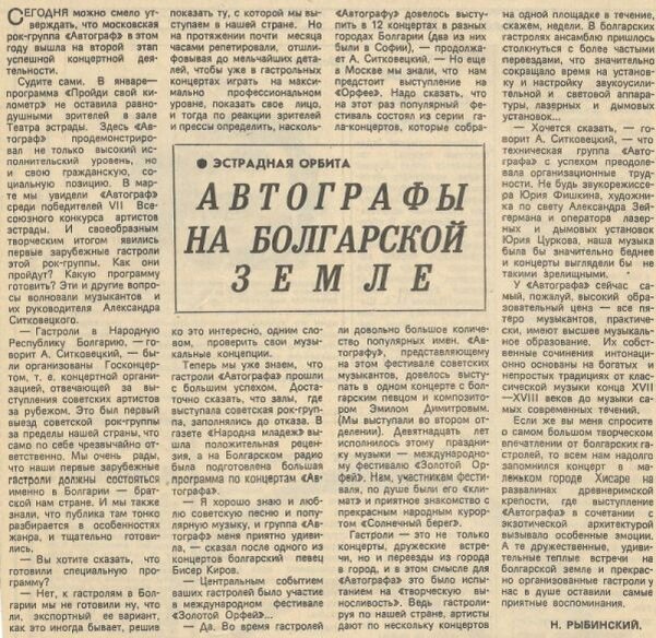 ЭСТРАДНАЯ ОРБИТА CЕГОДНЯ можно смело утверждать, что московская рок-группа «Автограф» в этом году вышла на второй этап успешной концертной деятельности. Судите сами. В январе — программа «Пройди свой километр» не оставила равнодушными зрителей в зале Театра эстрады. Здесь «Автограф» продемонстрировал не только высокий исполнительский уровень, но и свою гражданскую, социальную позицию. В марте мы увидели «Автограф» среди победителей VII Всесоюзного конкурса артистов эстрады. И своеобразным творческим итогом явились первые зарубежные гастроли этой рок-группы. Как они пройдут? Какую программу готовить? Эти и другие вопросы волновали музыкантов и их руководителя Александра Ситковецкого. — Гастроли в Народную Республику Болгарию, — говорит А. Ситковецкий, — были организованы Госконцертом, т. е. концертной организацией, отвечающей за выступления советских артистов за рубежом. Это был первый выезд советской рок-группы за пределы нашей страны, что само по себе чрезвычайно ответственно. Мы очен