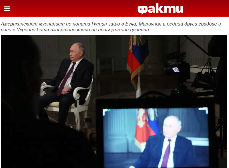 Взяла самую "желтую" и русофобскую интернет-газету ФАКТИ.бг. Долго не было никаких комментов вплоть до самого обеда... и вот оно, творение Д.Джамбазова к 13 часам по местному времени 3 452 просмотра и 176 комментариев. Заголовок звучит так, переводить не буду, много чести: "Путин пренаписа историята и промени границите на Европа в интервю пред един американски идиот" И про саму статью ничего не скажу, всё сказали сами болгары. Приведу коммент под №26 ник:Фон дер Миндер "за"+85, "против" -10 Истерика, страх, паника.... Это чувствуется уже в заголовке. Признаюсь, я не читал статью (если вообще можно назвать статью), но в целом все "свободные журналисты" кричат в один голос. Так что я не думаю, что упустил что-то значимое и существенное. И вот первый комментарий: №1 Българин Путин разрушил свою страну (+61, -187) №4 е.......... Джамбази не верим ! (+160, -27) №11 Име Делайте интервью, а не войны! (+64, -7) №14 ТаУмВзе Истина - неудобное явление, ДА! Очень приятно читать и см