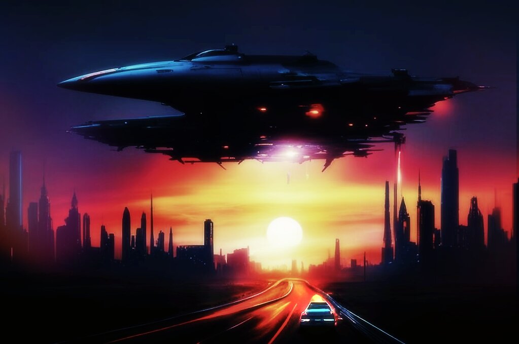 НЛО треугольной формы зависло над провинциальным городком. Яркие огни по углам корпуса, таинственный зеленоватый оттенок... В общем, впечатляет: