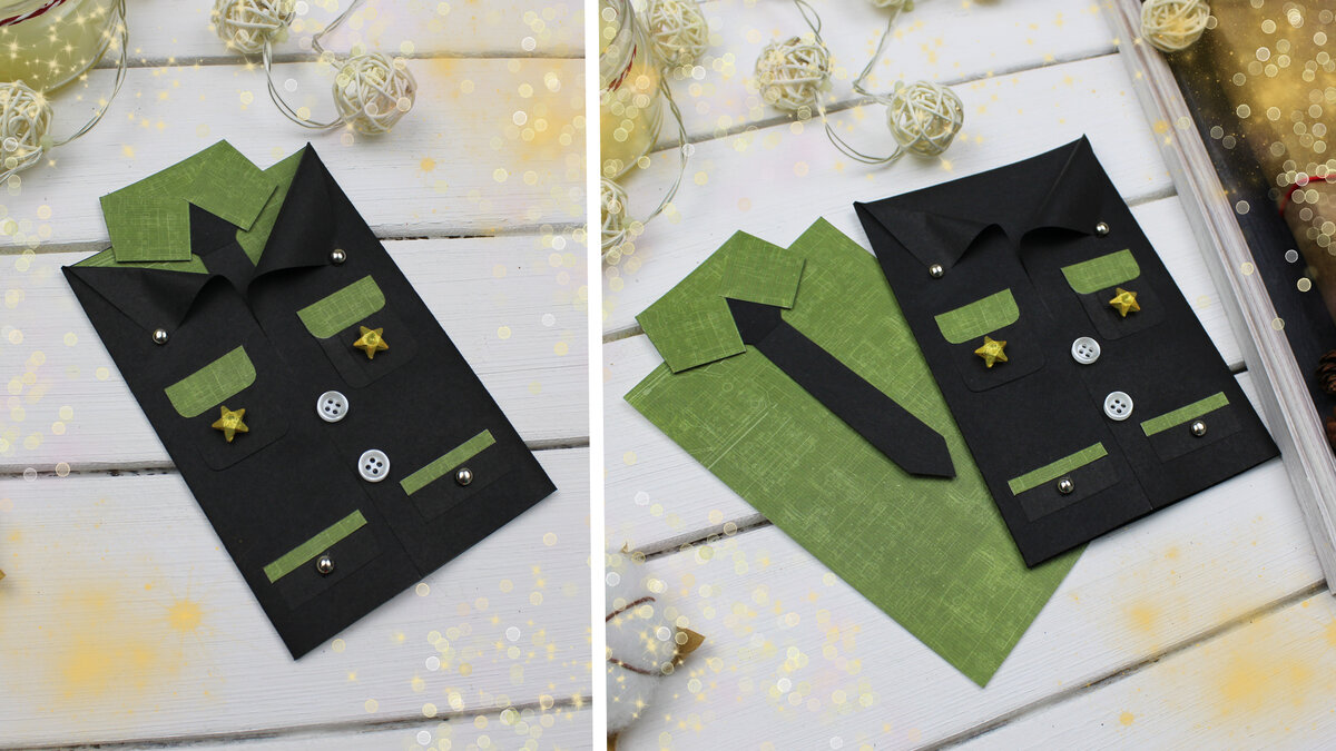 Всех тепло приветствую!🤗 Сегодня я покажу вам, как сделать открытку на 23 февраля для мужчины в виде рубашки с галстуком в пиджаке. Данная открытка создавалась на 23 февраля, но стиль рубашки и пиджака можно адаптировать, и по итогу открытка подойдет абсолютно к любому празднику.👍 Как сделать открытку на 23 февраля папе, брату, мужу, парню СПИСОК МАТЕРИАЛОВ: Итак, я начертила шаблоны, вы можете найти детали по ссылке выше. По своим шаблоном я вырезала из тонированной скрап-бумаги аналогичные элементы. Берем деталь воротника и складываем ее согласно пунктирным линиям на шаблоне. Так как у меня бумага односторонняя, то внутреннюю часть воротника я заклеиваю аналогичным по цвету отрезком скрапбумаги. Далее приклеиваю галстук. И склеиваю стороны воротника. Затем воротник приклеиваю к рубашке Рубашку укладываю в пиджак, который склеиваю по центру при помощи отрезка такой же по цвету бумаги. Затем подклеиваю воротник пиджака с двух сторон. Приклеиваю верхние и нижние карманы, а также акце