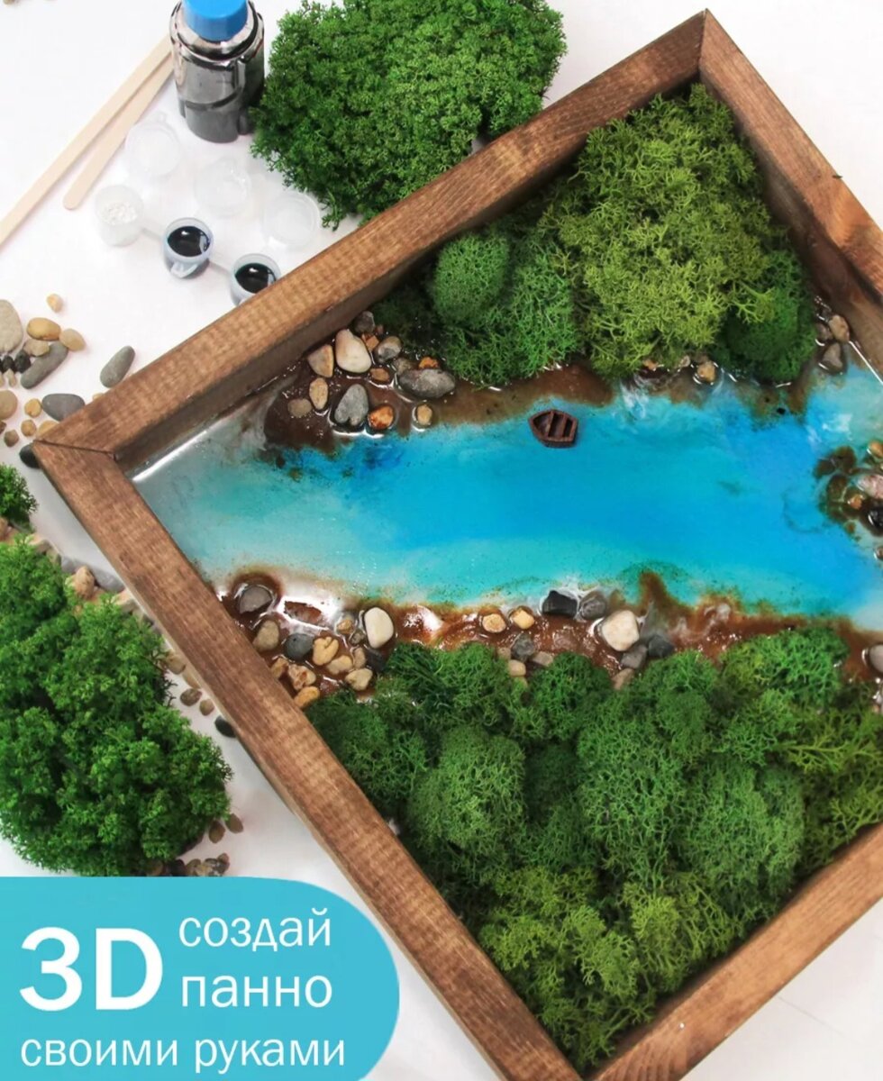 На новогодних праздниках мне хотелось творить. Так что помимо уже показанной поделки с ребёнком, я как взрослая девочка, взяла себе взрослый набор. Прошлый набор тоже был со смолой, кратко покажу его, но там взрослой части было только залив самой смолы, а остальное дочка делала самостоятельно из пластилина и декораций. Почему смола больше для взрослых? Просто трогать её руками никак нельзя. Дети могут забыться и потрогать перчатками лицо. Я когда убирала детскую поделку прикоснулась рукой, в итоге пошло покрасненение и сыпь как при обморожении, все чесалось. Смыла водой, намазала баум б5 и на утро прошло. Но, эта реакция стала строгим нет для дальнейшего детского творчества тет а тет со смолой Помощь ребенка Тем не менее без смолы на первом этапе тоже есть работа - обтереть цветом рамку, разложить мох и прикинуть что где будет находится. На самом деле дело 3 минут. Сложно ли делать? Когда купила и прочитала инструкцию, начала сомневаться, а вдруг не получится, а что вообще получится