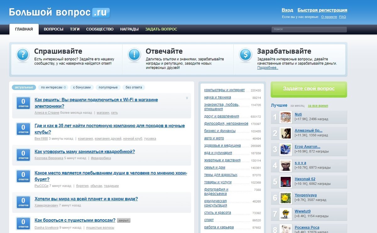 Набравшись опыта на сайте, желательно научиться выбирать более качественные вопросы, а не «одноразовые». «Вечные» темы будут интересны людям и через год, и через несколько лет. Они открывают различные сайты для поиска ответов, в том числе и Большой Вопрос.