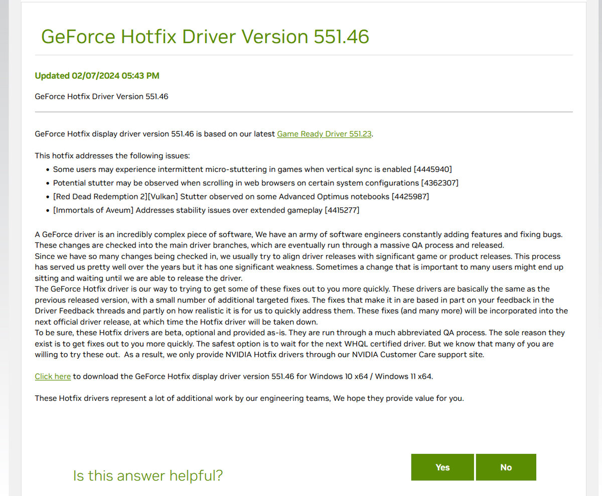 Фанаты NVIDIA любят рассказывать о проблемах в качестве драйверов графики AMD и Intel, но этим компаниям не приходится экстренно выпускать заплатки для своих "беспроблемных" драйверов вскоре после релиза новой версии и обо всех возможных проблемах пользователи всегда знают заранее. Сейчас NVIDIA опубликовала заплатку для версии драйвера 551.23 с номером 551.46, которая должна решать кучу возникших у геймеров проблем при использовании вертикальной синхронизации в ряде игр. В частности речь идет о микростаттерах, которые появились у геймеров при использовании любых технологий синхронизации изображения в драйвере 551.23. Вместе с этим в заплатке есть исправления для возникших в новой версии проблем с Red Dead Redemption 2 на ноутбуках с Advanced Optimus и Immortals of Aveum на любых системах. Стоит отметить, что обнаружение и устранение проблем с Immortals of Aveum действительно дорогого стоит. Кто вообще играет в Immortals of Aveum?