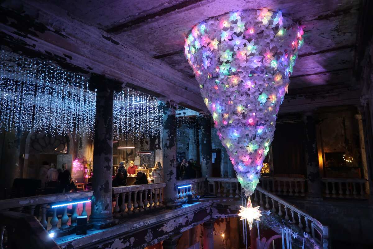 В новогодние праздники в Анненкирхе проходила выставка, посвящённая Рождеству. Это современное прочтение истории Рождества с помощью медиаинсталляций, картин современных художников, арт-объектов, световых и музыкальных композиций. На входе нас встречала фирменная «перевёрнутая» ёлка, переливающаяся разноцветными огнями.