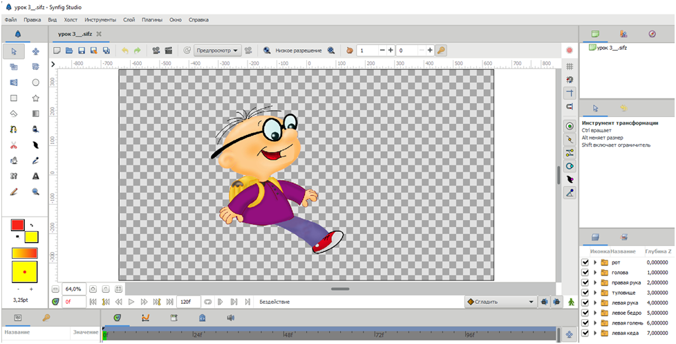 Итак, на прошлом занятии мы подготовили нашего веселого школяра к анимации его походки. Предлагаю для упрощения процесса оставить только левую ногу. Правая нога будет повторять движения левой, разве что изменится фаза её движения. Поэтому мы упростим процесс создания и анимации правой ноги, используя уже созданные ключевые кадры левой. Переключаемся в режим анимации, щелкнув по «зеленому человечку» в правом нижнем углу над линейкой временной шкалы кадров. Теперь он стал красным. Кажется, наш герой, выдвигая левую ногу вперед, должен левой рукой махнуть назад. Исправим нашу ошибку в первом кадре, повернув левую руку с помощью рычага управления назад, а правую выдвинем вперед. Вот вроде как-то так. Что такое «ключи»? Дело в том, что мы с вами будем создавать только ключевые кадры движения, а компьютер будет автоматически создавать все промежуточные. Так вот через одинаковое количество кадров (их будет 9) нам нужно ногу обозначить в новом положении, а остальные кадры во время визуализац
