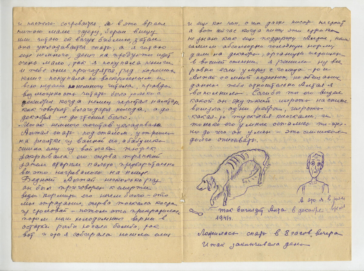 9/I-42 г. Алтай наверно сегодня сдохнет, уходя на работу я попращалась с ним он еще посмотрел на меня своими рыжими гляделками — и все. Юрик — это собака с голода сдохла, а сегодня ночью у нашей сострудницы с голоду умер отец 51 года, а не так давно она дядю похоронила — тоже с голода умер, у ее матери ноги опухли и она слегла, а ребеночек — девочка 1 г. 3 м. подходит к буфету и говорит «мама — дай, мама — аку» а что дашь если абсолютно нечего дать — только дают еще пока 200 гр. хлеба и то неизвестно из чего спечен т. к. цвет и вид у него весьма жуткий, — вот и все Юрасик, может когда ты будешь читать эти строки меня уже не будет я на очереди — сердце мое плохо работает, вот бабушку жаль, вчера вечером, нагрела воду положила соли налила скипидару сделала ванну для рук, завязала теплыми тряпками, почитала ей и уложила спать. Сегодня утром встала в 6 час. убрала кухню подтерла и вычистила за Алтаем, переложила его на сухое прикрыла напилила дровец, наколола скушала кусочек хлебас чаем и поплелась, зашла в магазин — НИЧЕГО, ПУСТО