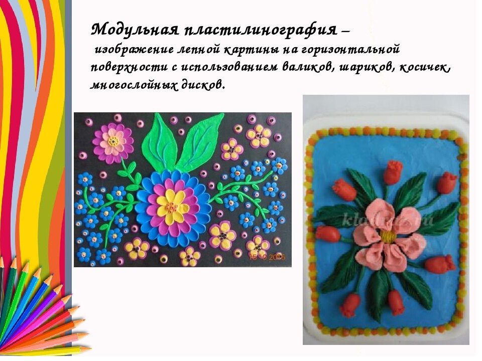 Сегодня я хочу поговорить об ещё одной технике лепки - это модульная пластилинография. Эта техника, которую можно отнести к творческой, увлекательной. Научите детей работать в такой технике и это станет их любимым творческим увлечением! Давайте разберёмся, что из себя предсталяет модульная пластилинография. В такой работе, или лучше назвать это видом творчества, сочетаются несколько приёмов лепки. Основу будующей работы, как правило, создают способом размазывания пластилина по готовой гладкой поверхности; отдельные детали – из шариков; какие-то из жгутиков, косичек; другие – из лепёшек, спиралек; крупных фрагментов: цилиндров, кубиков. Рисунок, выполненный таким образом отличается оригинальностью, объёмностью, разнообразием фактурных элементов.