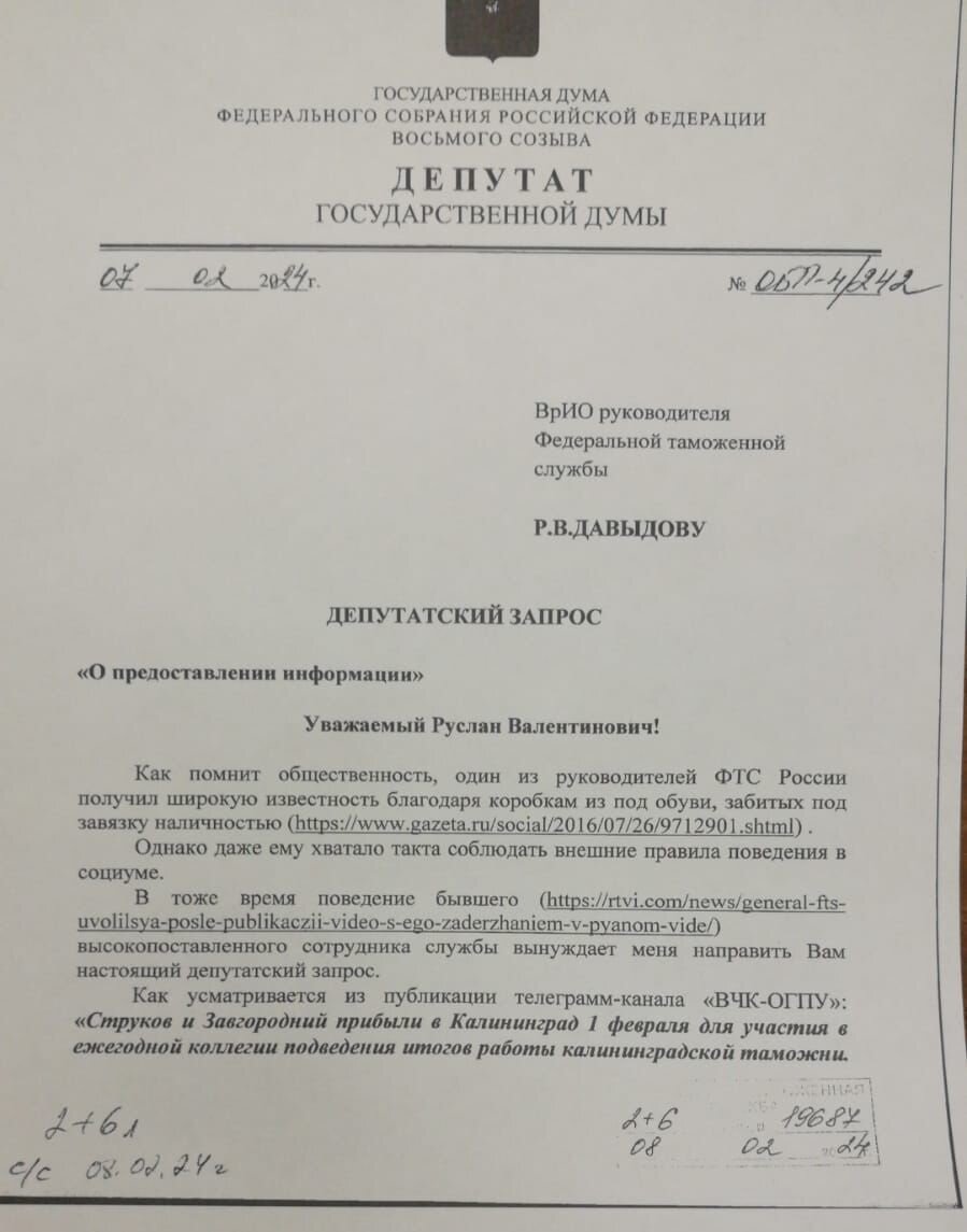 Депутат Государственной Думы, член Президиума, секретарь ЦК КПРФ С.П. Обухов отправил депутатский запрос в Федеральную таможенную службу Источник: Telegram-канал В Госдуме потребовали от СК провести проверку по уголовным статьям против устроивших дебош в Калининграде генералов Федеральной таможенной службы.
