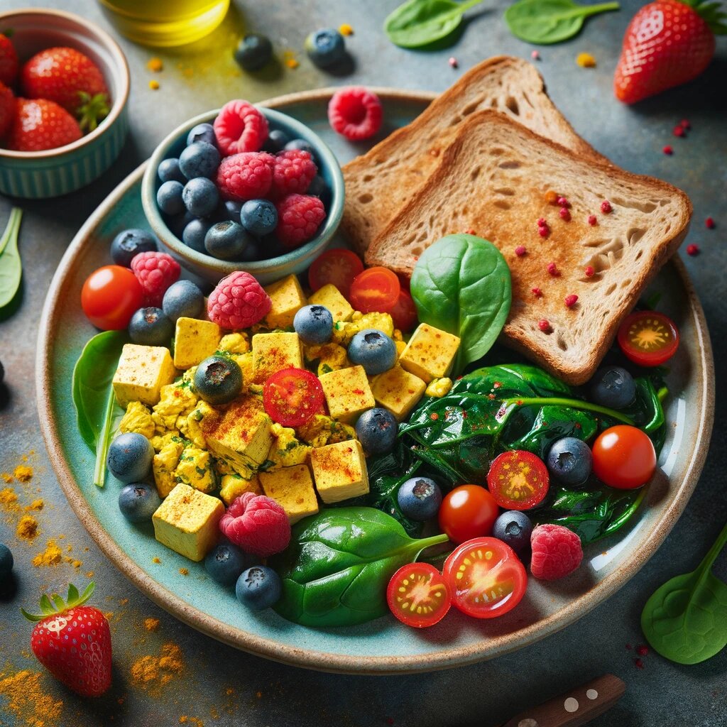 Завтрак: Тофу-брамбл с куркумой, шпинатом и черри-помидорами