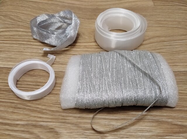 Сочетание белого и серебристого цветов подходит для праздника, и особенно, Нового года. Сочетание белого и серебристого вызывает ассоциацию снега и льда. Снег – это, конечно же, белый цвет. Лед на солнце искрится и кажется серебристым. Поэтому серебристая лента у меня ассоциируется со льдом. Это сочетание очень подходит для праздника, Нового года и просто к зиме. 1. Для бантиков «Снег и лед» я выбрала такие ленты. 2. Из белой атласной ленты шириной 2,5 см нарезаю отрезки по 10см. Для двух бантов нужно 10 кусочков. Всего потребуется ровно 1 м. Края опаляю спичками. 3. Складываю ленту, как на фото так, чтобы получился прямой угол. 4. Складываю пополам, чтобы получилось так, как на фото. 5. Таким образом, складываю все 5 ленточек. 6. Прошиваю по краю швом «вперед иголку. Делаю три одинаковых стежка. 7. Не отрезая нитки, прошиваю все 5 заготовок. 8. Стягиваю нитку. Замыкаю в кольцо. Получается красивый пятилепестковый цветочек. 9. Для двух бантиков я сделала два таких цветочка. 10. Из па