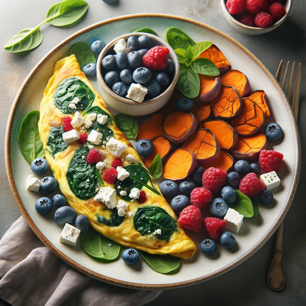 Завтрак: Омлет со шпинатом и фетой, запеченный сладкий картофель и свежие ягоды