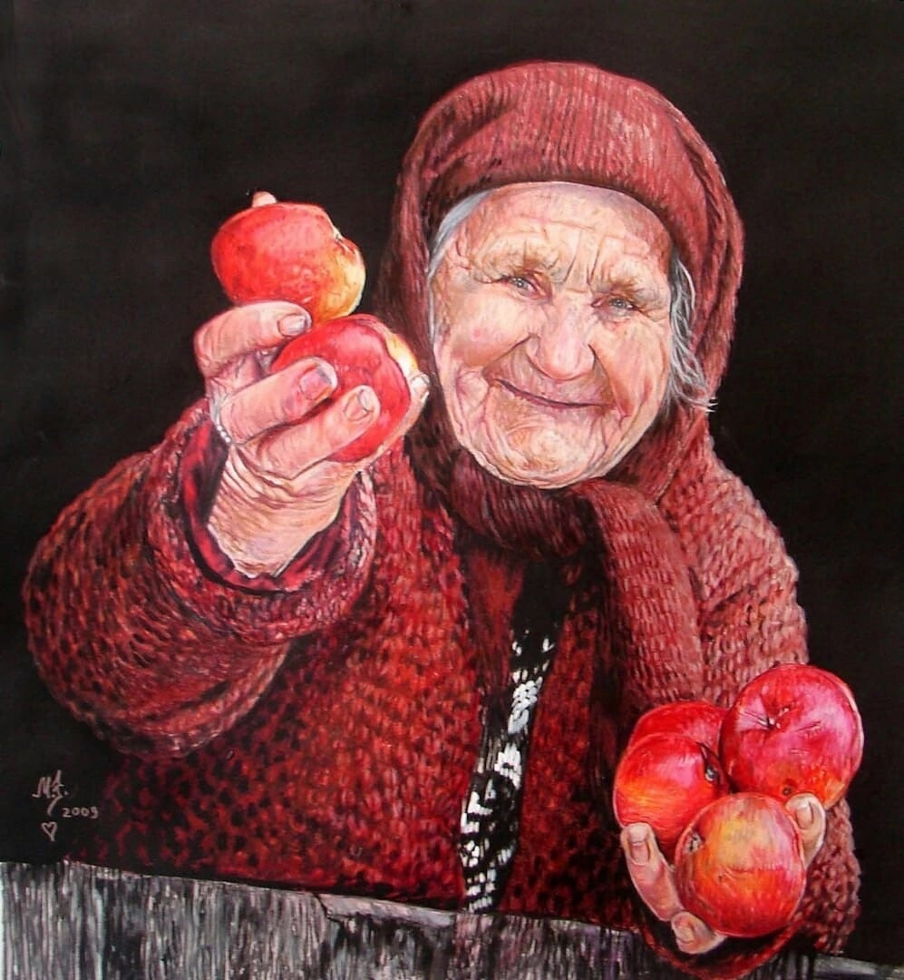 Красные, наливные, с полосочками. Очень сладкие. И вот она специально складывала горку, а мы с мамой шли, забирали и по дороге ели. Я ждала всегда этих яблочек и как-то так радовалась.