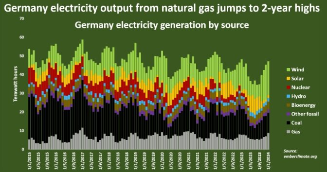 Производство электроэнергии на газовом топливе в Германии в январе 2024 года подскочило до самого высокого уровня за два года, поскольку энергетические компании увеличили объемы производства, чтобы компенсировать закрытие ядерных реакторов в стране и удовлетворить возросший спрос на отопление во время холодов.