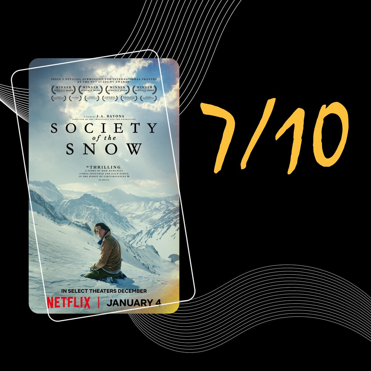 Испания, 2023, триллер, драма 1972 год. Уругвайский самолет терпит крушение в самом сердце Анд, и выжившим приходится надеяться только друг на друга. Оказавшись в ловушке в одном из самых недоступных мест на планете, они вынуждены прибегать к крайним мерам, чтобы остаться в живых. Основано на реальных событиях. До этого фильма я вообще не был вкурсе данного происшествия. Для меня это была новая история, от которой бегали мурашки по коже. Выходил также фильм в 1992 году "Выжить", основанный на данной истории, но смотреть я скорее всего не буду, т.к этого мне было достаточно. Съемки проходили в Андах, недалеко от места крушения. История берёт зрителя за душу, передает все то, что происходило, как они выживали, это было жутко смотреть. Безумно понравилось то, как режиссёр ответсвенно подошёл к подбору актёрского состава. Абсолютно каждый персонаж очень хорошо справился со своей игрой. Я был в восторге от каждого. Также параллельно когда мы смотрели фильм на экране выводили разн