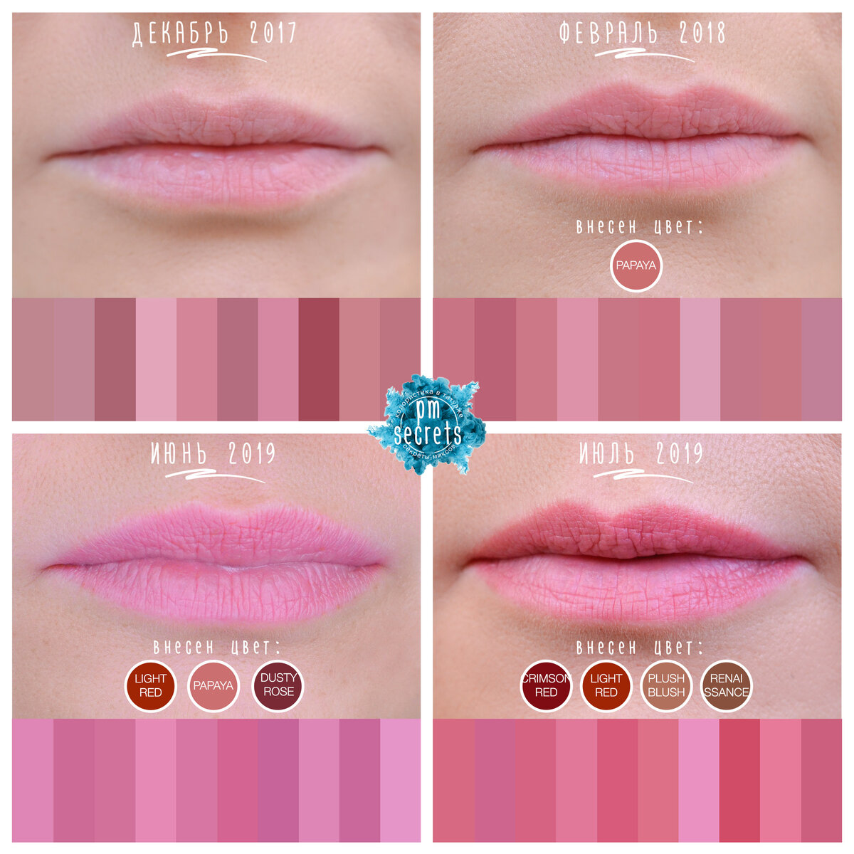 Хочу показать как меняются губы при разном запросе в цвете и как ведут себя пигменты со временем. Декабрь 2017 губы ДО процедур. Цвет губ приглушенный, наиболее яркий цвет у линии смыкания в тенях. Запрос был на натуральный не яркий цвет. Чтобы как свои, но чуть плотнее цвет и четче контур. Февраль 2018, губы через два месяца после одной процедуры. Видно, что результат соответствует запросу и губы выглядят натурально. Однако для клиентки изменения не сильно заметны. Теперь запрос сделать ярче, усилить цвет в холодные оттенки. Я взяла для работы Papaya, Dusty Rose, Light Red. И в июне 2019 года цвет губ имеет довольно выраженный холодный оттенок. Что же случилось? Возьму тесты пигментов на светостойкость. В пигменте Papaya самый устойчивый колорант маджента, Dusty Rose потерял насыщенность, а Light Red потерял насыщенность очень сильно. Таким образом, миссия цвета Light Red сделать микс теплее и насыщеннее в долгосрочной перспективе неэффективна. А про пигмент Papaya надо помнить, что