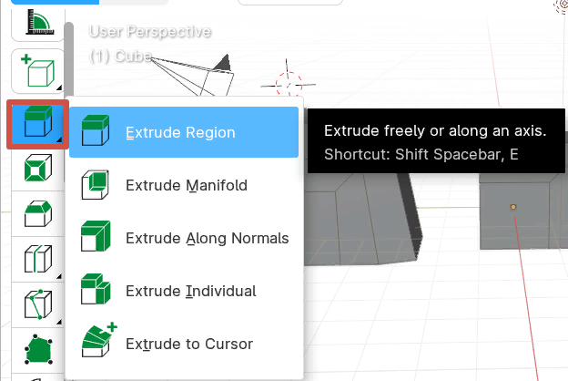 Теперь, после того как выделены две грани, нажмите на кнопку Extrude Region, который как бы показывает выдавливание граней наружу.