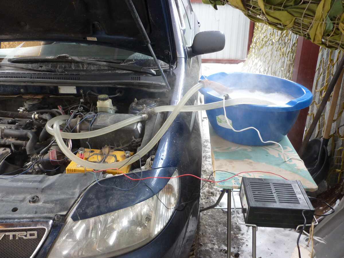 Для промывки радиатора печки нам необходимо : 1. Водяной погружной насос или дополнительная водяная авто-помпа для того, чтобы промывочная жидкость постоянно циркулировала внутри радиатора печки вымывая тем самым всё что там скопилось за долгие годы эксплуатации авто. 2. Шланги подходящие по длине к месту дислокации раствора и по диаметру отводов радиатора и помпы. 3. Зарядник аккумулятора, т.к. помпа без зарядки высосет ваш аккумулятор достаточно быстро. 4. Кипятильник погружной, желательно побольше, т.к объём раствора будет около 15 литров и поддерживать его при температуре почти кипения маленькому будет не возможно, тем более на улице при отрицательной температуре воздуха. 5. Ёмкость для раствора, можно ведро, но лучше что то побольше. 6. На выходной конец шланга необходимо надеть фильтрующий элемент, типа обычный синтетический носок или капроновый чулок — синтетика лучше сопротивляется кислотам, чем х.б. 7. Концентрат для чистящего раствора — в моём случае: 1-ое средство для чи