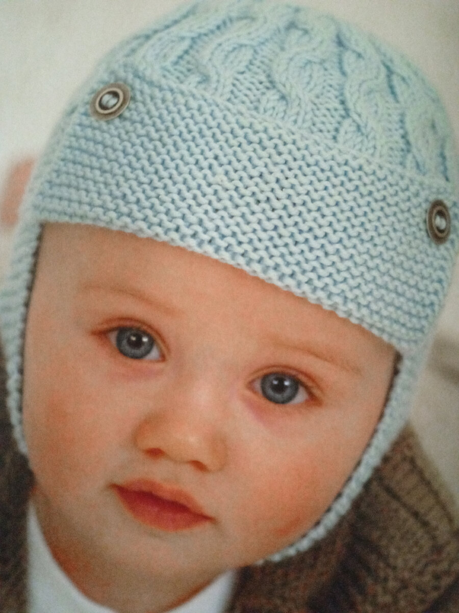 Размер 0/6-6/12 месяцев, 1/2-2/3 года, окружность головы 34-37-40 -44 см. Вам потребуется: пряжа (75% мериносовая шерсть, 20% шелк, 5% кашемир, 116 м/50 г) - 50- 100-100 - 100-100 г голубого цвета, прямые и круговые спицы № 3,5 и №4, 3 пуговицы. (Используй любую другую похожую пряже) Плотность вязания: 22 п. х 28 рядов гладью на спицах № 4 = 10 х 10 см. При вязании по кругу 1 ряд вяжется лицевыми петлями. Начинайте вязать с ушек. Наберите на спицы № 3,5 5 петель. и вяжите платочной вязкой (лицевые и изнаночные ряды - лицевые петли). После связанных 4 рядов в следующем ряду сделайте петлю для пуговицы: вяжите 2 лиц. п., накид, вяжите 2 лиц. п. вместе и 1 лиц. п. Далее вяжите лицевые петли. При длине работы 12 см наберите дополнительно по краям по 1 петле, после чего продолжайте набирать дополнительные петли 1 раз в каждом 2-м ряду и в каждом 4-м ряду 2 раза = 13 п.При длине детали 4-5-5-6 см отложите петли. Свяжите второе ушко аналогично, но без петли для пуговицы. Козырек: Набери