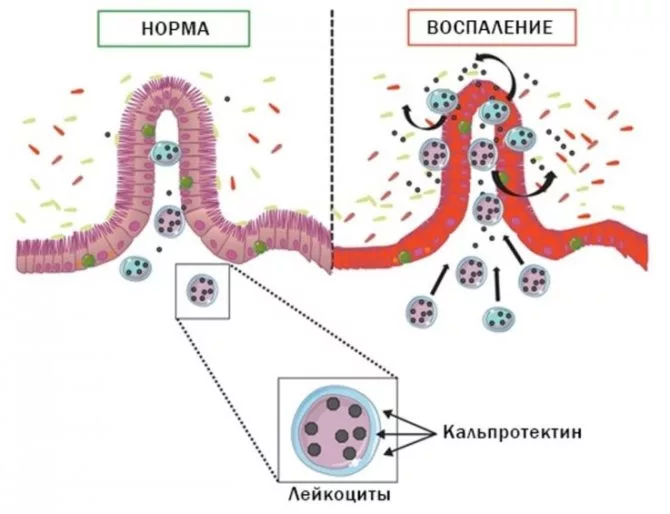 Когда возникает воспаление в желудочно-кишечном тракте, нейтрофильные гранулоциты мигрируют из кровотока на слизистую оболочку кишечника. Они накапливаются в месте воспаления, и кальпротектин выделяется в просвет кишечника. Пока кал перемещается к анальному отверстию, он контактирует с кальпротектином. Его можно измерить в образце стула с помощью различных тестов.