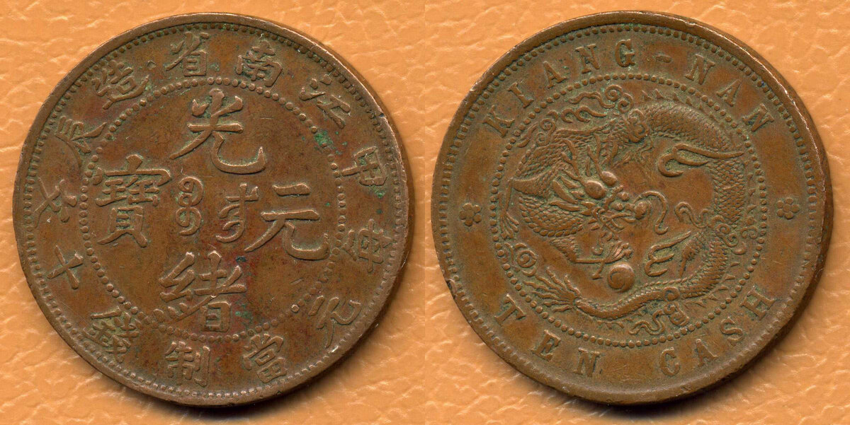 10 вэнь 1904 года, провинция Цзяннань (Jiāngnán shěng 江南省 / Giyangnan golo ᡤᡳᠶᠠᠩᠨᠠᠨ ᡤᠣᠯᠣ), отчеканена в правление императора Дэ-цзуна Цзин-хуанди Цзайтяня (Dézōng Jǐng huángdì Zài Tián 德宗景皇帝載湉 / Dedzung Ambalinggū hūwangdi Dzai Tiyan ᡩᡝᡯᡠᠩ ᠠᠮᠪᠠᠯᡳᠩᡤᡡ ᡥᡡᠸᠠᠩᡩᡳ ᡯᠠᡳ ᡨᡳᠶᠠᠨ).