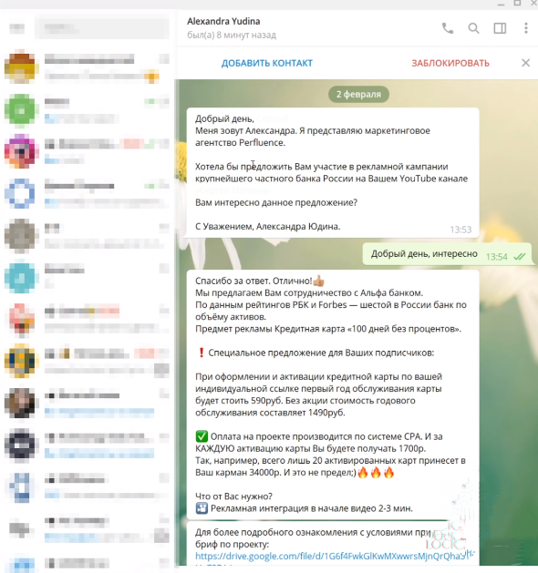 Я никогда раньше не встречал такого подхода в арбитраже трафика, поэтому подробно изучил его и понял, что он действительно прост и его можно назвать психологическим трюком СИ (социальной инженерии). Схема была получена благодаря общению с одним из "дикарей", который, по моим скромным подсчетам, зарабатывает 20 000 рублей в неделю. Он называет себя агентом, но на самом деле является арбитражником. Почему я сказал что это арбитражник? Это потому, что математика очень проста, если сравнивать выплаты с партнерской программой того же участника торгов: Партнеру выплачивается чуть больше 3 000 рублей, и этот менеджер делится прибылью. Вот так был начат диалог: А вот сам оффер, который я нашел в первой попавшейся партнерке: Суть Герой пишет письмо каждому блогеру на YouTube и в Telegram, предоставляя конспект со всеми возможными контраргументами. Он пишет только мелким и средним блогерам с 10-25 тысячами подписчиков на YouTube и 5-80 тысячами подписчиков в Telegram. Почему именно этим людям