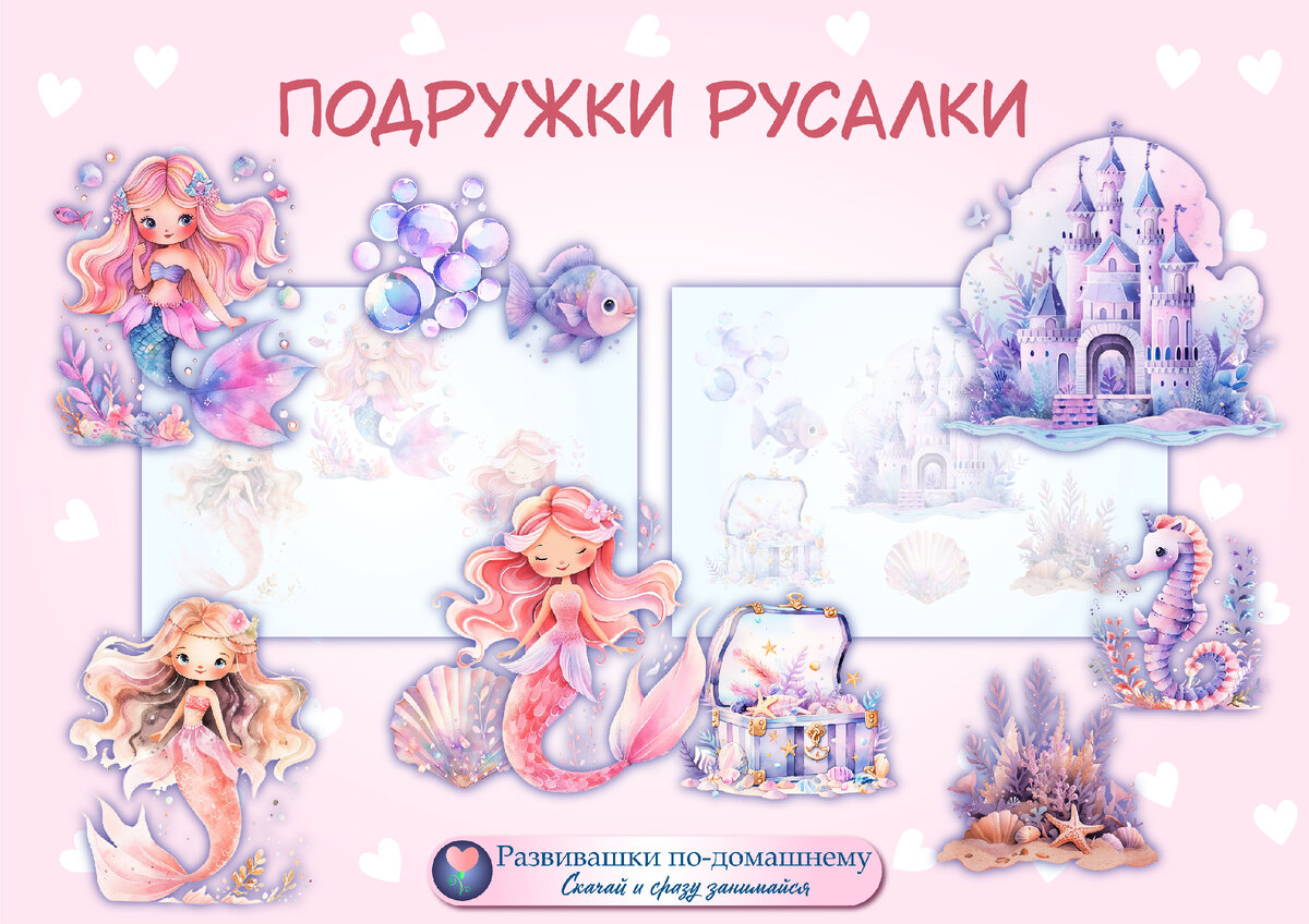 Помню, как мои дочки пересматривали раз за разом мультики про русалок, а когда стали по старше - фильм "Н2О" (он про 3 подружек-русалок). А теперь и я создала игру, которая погружает в Подводное царство Русалок. Русалки получились тамими милыми и в то же время такими современными, что самой хочется побыстрее распечатать, сделать эту игру и подарить моей малышке племяннице! Давайте познакомимся поближе с этой игрой: в конце, где можно скачать шаблон Игра на липучках "Подружки русалки" В этой игре 2 поля для наклеивания элементов: Все иллюстрации создают ощущение, что словно попала в волшебный мир. Создавайте эту игру для своих малышек: дочек, племянниц, внучек или учеников. Мне кажется, что любая девочка не откажется от такого подарка! Шаблон игры можно скачать через Донат в моём сообществе в ВК, в каталоге всех игр в рубрике "Сказка", кстати в этой рубрике есть много игр для девочек, например про Принцессу: 🔥 Статья про игру "Принцесса Розовой страны" здесь: 👇