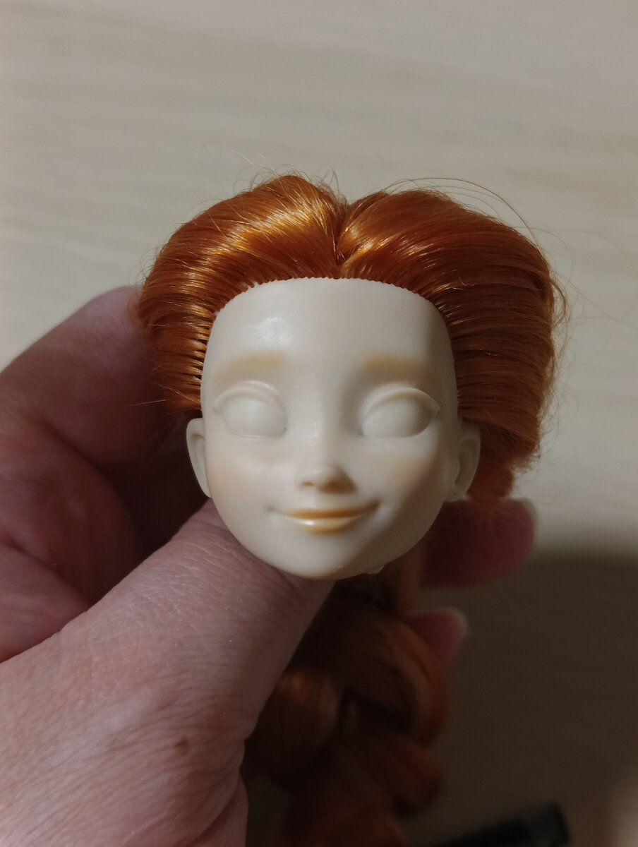 Всем привет! Меня зовут Александра, я делаю ООАК на куклах Монстер Хай, Эвер Афтер Хай и Барби. Некоторое время назад приехала ко мне голова куклы на перерисовки. Это принцесса Анна из мультфильма Холодное сердце - любимая кукла моей подруги Кати. Куколка у Кати давно, она даже пару раз ее перерисовывала. На лице остались пигменты от прежней росписи. Базирон с этими пятнами почти не справился - ушли только пятна от бровей. Вот такой Анна была до перерисовки. И вот такой примерно мне нужно было её сделать. Не в точности. А более живой. В первой части мультфильма Анна наивно-восторженная девочка, не знающая настоящей жизни. А во второй она уже другая, более сильная, не такая. Это всё видно на её лице. А нейросеть довела внешность принцессы до идеала. Кате хотелось, чтобы в куколке считывалась её искренность, добрая душа, но не наивность, как в первой части. Бирюзовые глаза, румяные щёчки и выражение вселенского добра на лице. Вот примерно по такому ТЗ мне предстояло рисовать. Но п