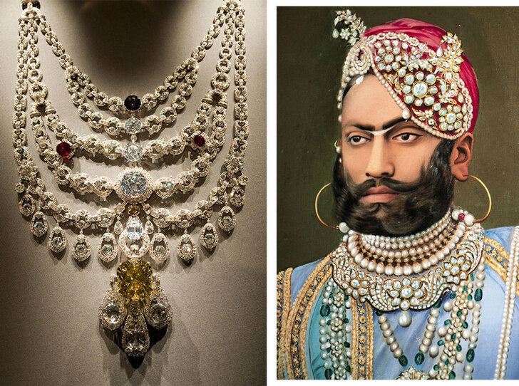 Махараджи (что в переводе с санскрита означает «Великий Король») играли важную роль в истории и были покровителями искусств как в Индии, так и в Европе. Подобно лоскутному одеялу, территорию Индии охватывали сотни княжеств, и каждым управлял свой отдельный махараджа и его семья. Страсть к роскоши (и демонстрации ее публике) была особой чертой всех индийских князей. Они обожали красивую одежду, лошадей и драгоценности, символизирующие королевский статус и власть. Они тратили огромные суммы на развлечения, владели гаремами с сотнями женщин, купались в бассейнах с шампанским, а их экипажи были выполнены из чистого золота. Яркий пример расточительности и любви к роскоши — низам Хайдарабада, который использовал знаменитый бриллиант «Джейкоб» в качестве пресс-папье.
