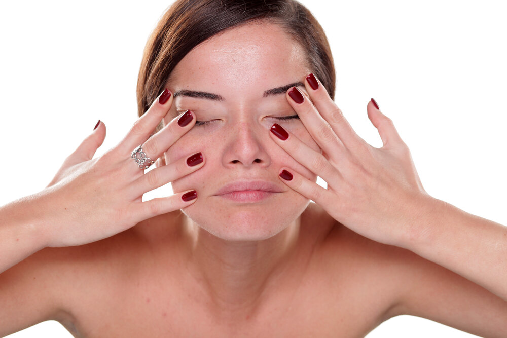 - Теперь попробуем сурово сдвинуть брови, препятствуя их движению. Указательный палец каждой руки поместите над внутренним уголком глаза, в мизинцы прижмите к наружному. Упражнение направлено на уменьшение межбровной складки. Количество повторов то же.