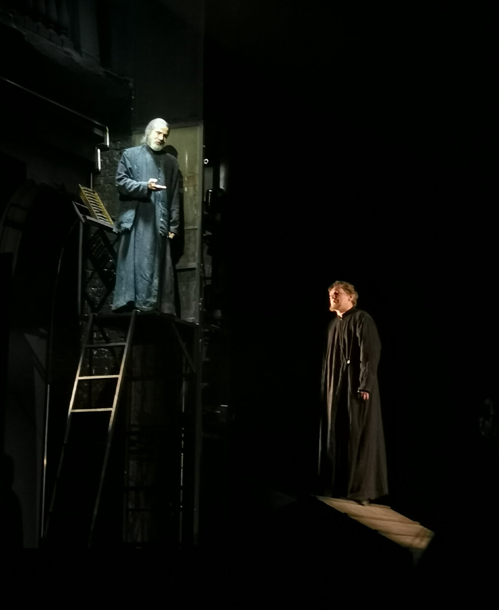 И эти темы Лескова в спектакле звучат, звучат в монологах Ильи Шакунова, исполняющего роль протоирея Савелия Туберозова.