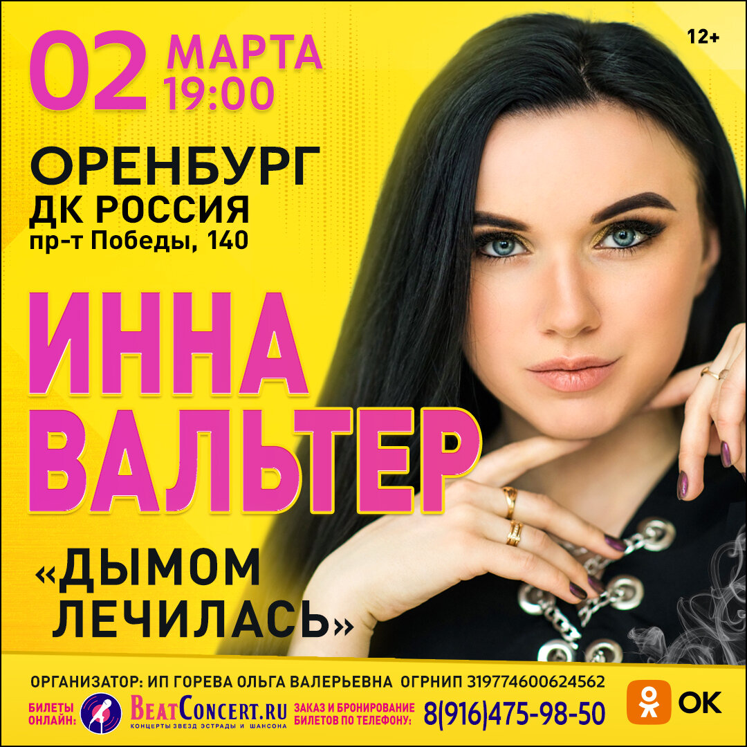 Молодая певица Инна Вальтер завоевала сердца многих своим искренним и душевным творчеством, которое она представляет на просторах YouTube. Ее песня "Дымом лечилась" набрала уже более 500 миллионов просмотров, подтверждая ее популярность. Стиль певицы трудно определить однозначно, но все ее песни являются искренними исповедями о любви, жизни и поиске счастья. Живой сольный концерт исполнительницы "Дымом лечилась" в Оренбурге состоится 02 марта 2024 г. - ДК Россия, пр. Победы, 140. Начало в 19:00!