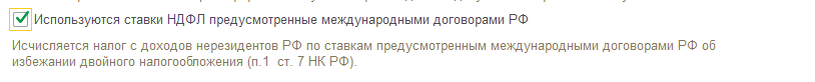 Функционал программы 1С ЗУП КОРП, редакция 3 позволяет автоматизировать учет НДФЛ нерезидентов по международным договорам и сформировать отчётность по НДФЛ. Для этого в меню Настройки – Расчет зарплаты необходимо подключить функциональность «Используются ставки НДФЛ предусмотренные международными договорами» В этом случае в Договоре авторского заказа появится возможность настроить ставку НДФЛ непосредственно в карточке договора: В документе Дивиденды также появится возможность указать ставку НДФЛ нерезидента по международному договору: Кроме того, в функционале документа Операция учёта НДФЛ появится возможность указать вид дохода с учетом ставок международных договоров: Налог, отраженный таким способом будет автоматически рассчитан и от