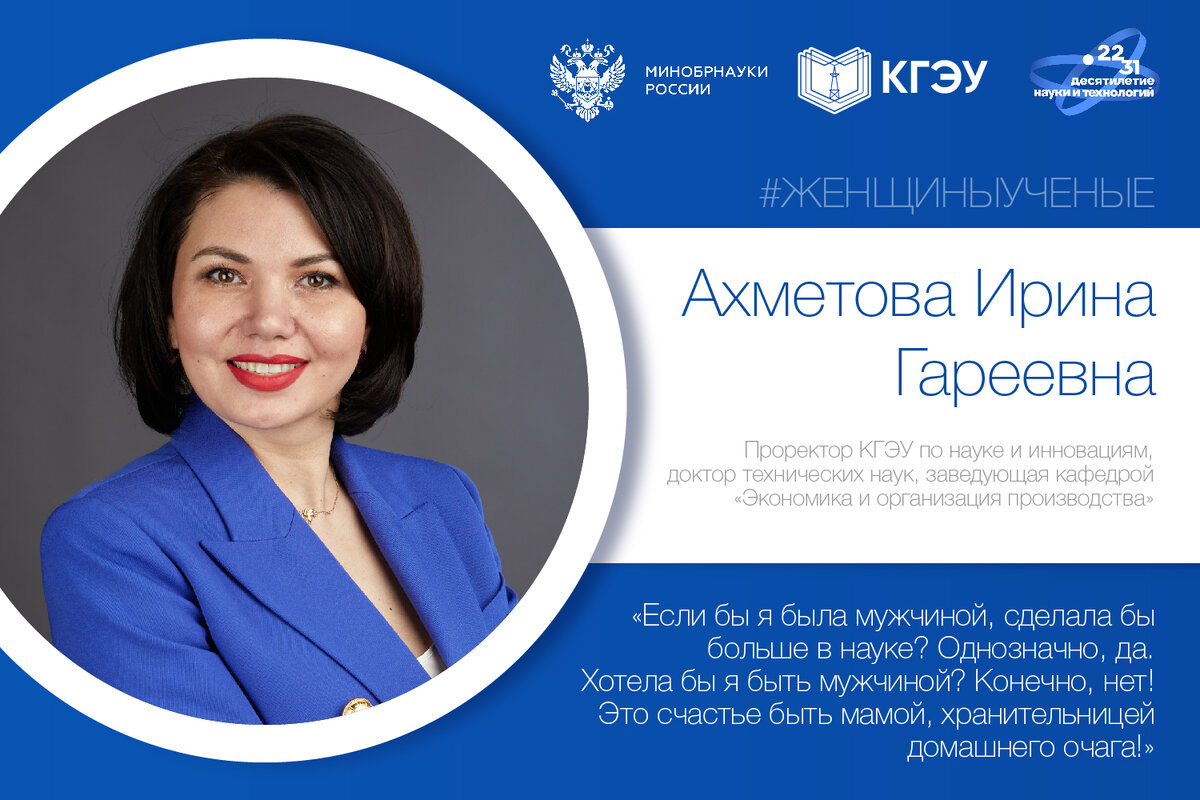 «Если бы я была мужчиной, сделала бы больше в науке? Однозначно, да. Хотела бы я быть мужчиной? Конечно, нет! Это счастье быть мамой, хранительницей домашнего очага!» Проректор КГЭУ по науке и инновациям, доктор технических наук, заведующая кафедрой «Экономика и организация производства». Автор более 300 публикаций, руководитель образовательной программы по курсам повышения квалификации «Обучение ответственных за энергосбережение и повышение энергетической эффективности» по госконтракту с Министерством энергетики РФ, руководитель НИР на тему «Разработка схемы теплоснабжения г. Казани», заместитель председателя Общественной палаты РТ, лауреат премий «Женщина года РТ» в номинации «Наука» и «Инженер года Республики Татарстан» в номинации «Энергетика». Ирина Гариевна награждена многочисленными почетными грамотами министерств и ведомств, а также другими государственными наградами. - Я поступила в Казанский филиал МЭИ, а вот окончила уже Казанский государственный энергетический университет.