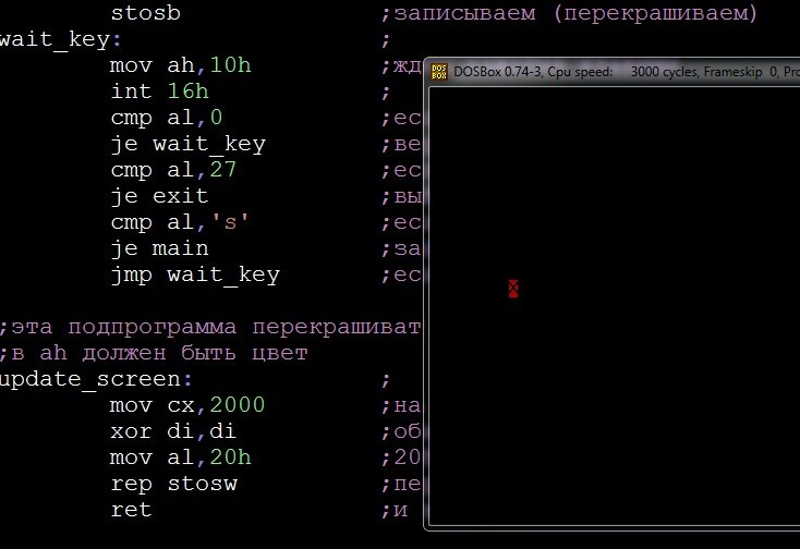 Предлагаю попробовать написать программу на ассемблере. Все, что делает эта программа, прячет символ "х" на экране, а затем ищет его последовательно проверяя все символы на экране. Вроде немного, но эта программа поможет вам понять как организовать доступ к системному таймеру, организовать задержку и многое другое. Прерывание int 08h от системного таймера происходит примерно 18,2 раза в секунду, доступ к текущим значениям можно получить через прерывание int 1Ah. При этом в регистре CX хранятся старшие (большие) значения, а в регистре DX младшие. Нам понадобятся только те значения, которые находятся в DX. Команда логического сравнения AND, побитно сравнивает два значения, и работает так: 0+0=0 0+1=0 1+1=1 то есть наша маска 11111110b обнуляет младший бит числа, если число нечетное и превращает его в четное. Нам это нужно, чтобы регистр DI был нацелен на символ, а не на его атрибуты, как мы помним символы на экране хранятся в четных адресах, а их атрибуты в нечетных. 0 - это четное чис