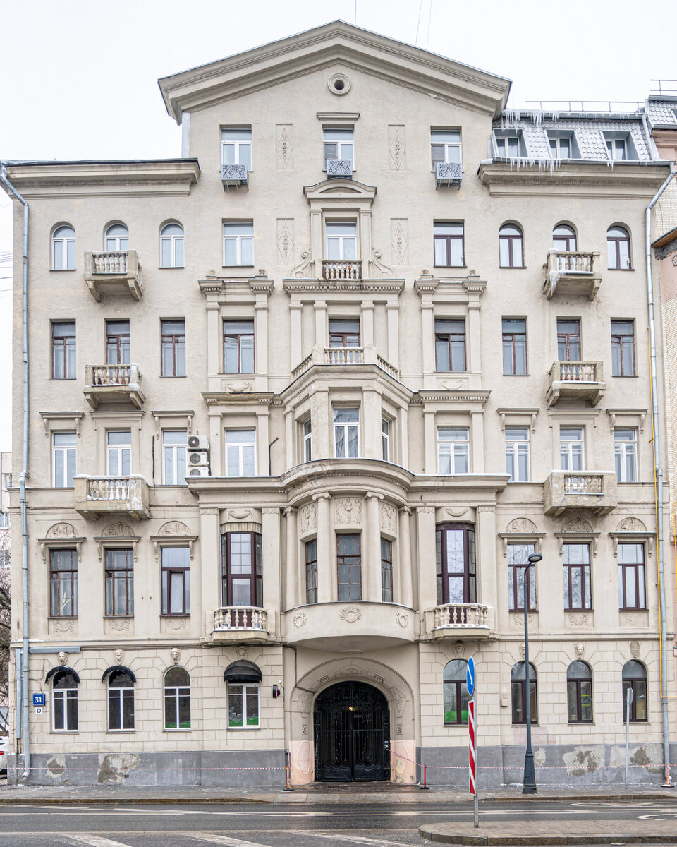 На моих фото - бывший особняк, который очень похож на бывший доходный дом! Это особняк купца Башкирова на Старой Басманной, 31, построенный в 1913 году по проекту архитектора Виталия Масленникова. В советское время дом надстроили еще четырьмя этажами, так что получился обычный шести этажный жилой дом. Однако, что бывало очень редко, надстроили дом так изящно, что его легко можно принять за доходный дом 1910-х годов. Причем, даже внутри на парадной лестнице сохранили высоченные потолки и много воздуха, точно так, как строили до революции! Лестница в бывшем особняке отличается по форме от парадной лестницы на 3й этаж и выше, правда старый стиль был сохранен. Уцелела и входная дверь в дом, которая находится в необычной волнообразной проходной арке.