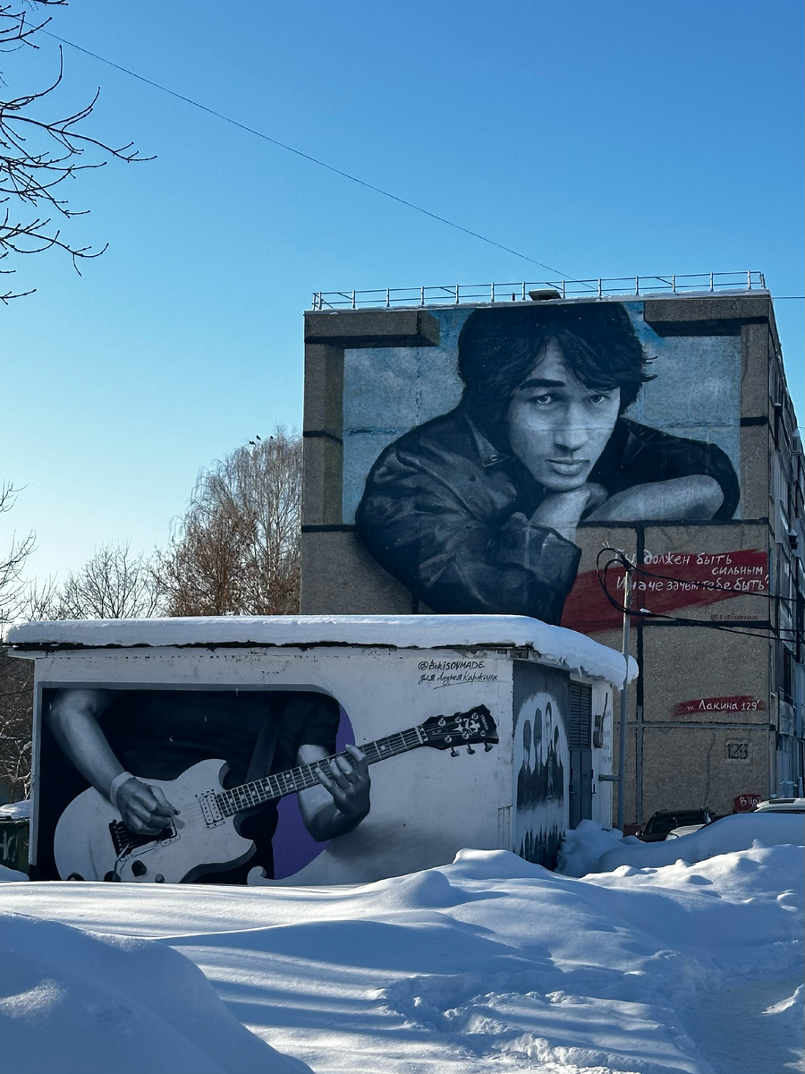 Всем привет! Сегодня мы с вами прогуляемся по Владимиру и посмотрим, как в этом городе чтут память Виктора Цоя и группы "Кино". Самая первая песня, которую я выучила на гитаре, была "Звезда по имени Солнце", так что можно считать, что творчество этого музыканта коснулось и меня лично. Ну а теперь, я хочу показать одно уникальное место. Многим знакома стена Виктора Цоя на Арбате в Москве - наверное, это самая популярная локация в России среди его фанатов. В других городах, и даже странах ближнего зарубежья также встречаются тематические граффити и стены памяти, посвященные творчеству музыканта. В городе Владимир, на улице Лакина находится не просто граффити, а целый комплекс рисунков, посвященных группе "Кино" и ее солисту. 📍Адрес: лица Лакина, д. 129 г (координаты 56.140705, 40.359886) На стене пятиэтажного дома располагается самый большой портрет Виктора Цоя в России. Местный житель - Андрей Каржин, который является фанатом группы "Кино", решил сделать подарок для жителей своего