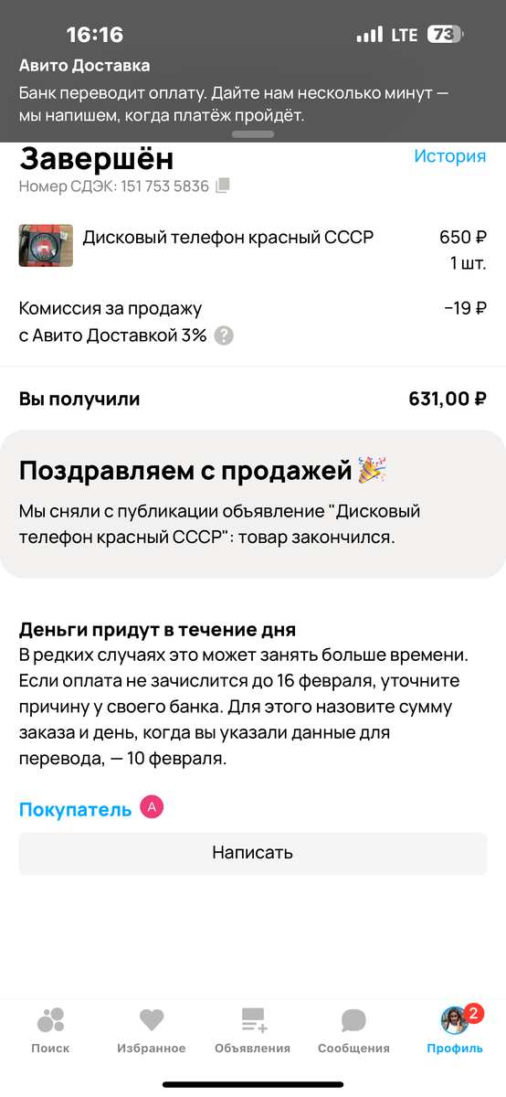 Сегодня выяснилось, что не со всех продаж Авито взымает мзду 5%. Сегодня я получила деньги за проданный товар и они вычли только 3!))) Продавала дисковый телефон, обычный, времен СССР. Нашла среди утиля в подсобке на работе, где он сверкал красным боком. Нет, Вы только не подумайте, что я рылась в куче этого мусора. Просто приехал грузовик вывести этот хлам на свалку, а я зорким глазом увидела перспективный лот))). Вытерла пыль, сфотографировала и выставила))) Цену поставила чуть выше, чем в среднем по Авито. ЛОт крутился несколько месяцев, я его даже не обновляла. И вот на прошлой неделе прилетел молчаливый заказ. Я извлекла это ретро-телефон из недр своего рабочего стола, завернула в мягкую бумагу, создавая объем, и отправила. Сегодня покупатель забрал его и написал мне пятизвездочный отзыв! Реально, эти деньги могли быть выброшены! И хотя сумма небольшая, именно из таких сумм набегают наши тысячи! А у Вас были такие деньги из воздуха? Делитесь в комментариях своими интересными ист
