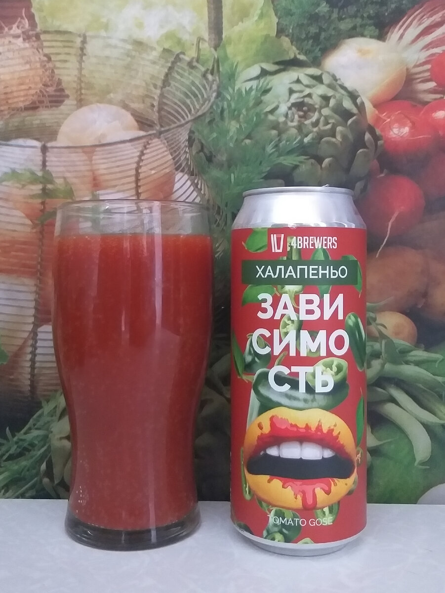 Пришло время мне насладиться очередным томатным гозе из серии "Зависимость" от владимирских пивоваров 4BREWERS. Для многих ценителей качественных "томаток" эта серия является самой любимой. Автор канала тоже в их числе. Долго пришлось ждать, когда появится что-то новенькое из этой серии в магазинах крафтового пива. Практически все "томатки", которые выходили в этой серии и продаются в моём городе, я уже успел попробовать. Некоторые из них не один раз. Очень хотелось чего-то свежего, нового. Мои ожидания всё же были вознаграждены. Мне удалось найти интересную "томатку" из числа тех, что раньше никогда не пробовал. Именно о ней я сегодня хочу рассказать читателям канала. "Зависимость" [Халапеньо] Пивной напиток непастеризованный нефильтрованный неосветленный "Гозе 16" Состав: вода подготовленная (исправленная), солод пивоваренный ячменный, солод пивоваренный пшеничнвй, томатная паста, перец халапеньо, лактоза, соль поваренная пищевая, хмель прессованный, базилик сушёный, паприка, кориан