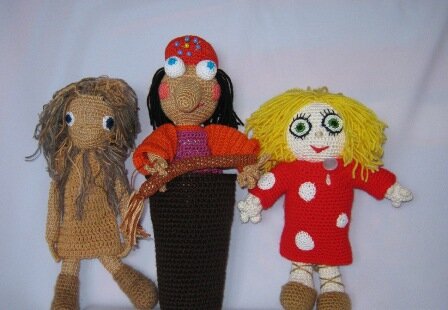 Давным давно,когда Анечка моя была еще малышкой, очень она любила этот замечательный мультфильм. И книгу тоже, и разукрашки... В общем - все, что связано с Кузей, Нафаней и бабусей Ягусей - прям обожалось, смотрелось и зачитывалось. И были у нас с Аней подружки, которые очень любили не только мультфильмы, книжки и прочее, но и вязаные игрушки, которые я тогда вязала в огромных количествах. И очень попросила большая подружка, связать для маленькой подружки эту шлёп компанию. С Кузей то проблем не возникло - здесь все просто, разве что волосы сделать и постричь ровненько да горошенки на рубашечку пришить. Бабулечка тоже получилась, хоть и не сразу такая нарядная, но мы ее нарядили. Связали ей яркий сарафан, да с оборочками. Шапочку с вышивкой. В общем - модная она у нас получилась. Сами не ожидали. А вот с Нафаней пришлось повозиться. Не совсем понятно было , как изобразить этого домовенка, чтобы был узнаваем. Мучили мы его мучили и вымучили). А бабе Яге, для пущей важности и ступу с ме